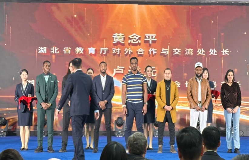 公司国际员工富兰克林荣获湖北文旅大使第二名,湖北省教育国际交流协会会长蒋涛为文旅大使颁奖。