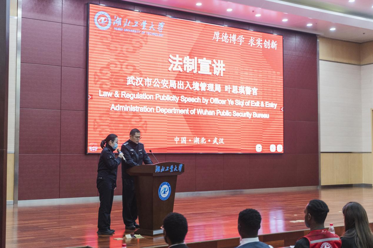 在法制宣讲环节,武汉市出入境警官向同学们介绍了在华学习期间需要遵守的相关法律法规,并特别强调了非法滞留、非法实习等违法违规情况所需承担的严重法律后果。