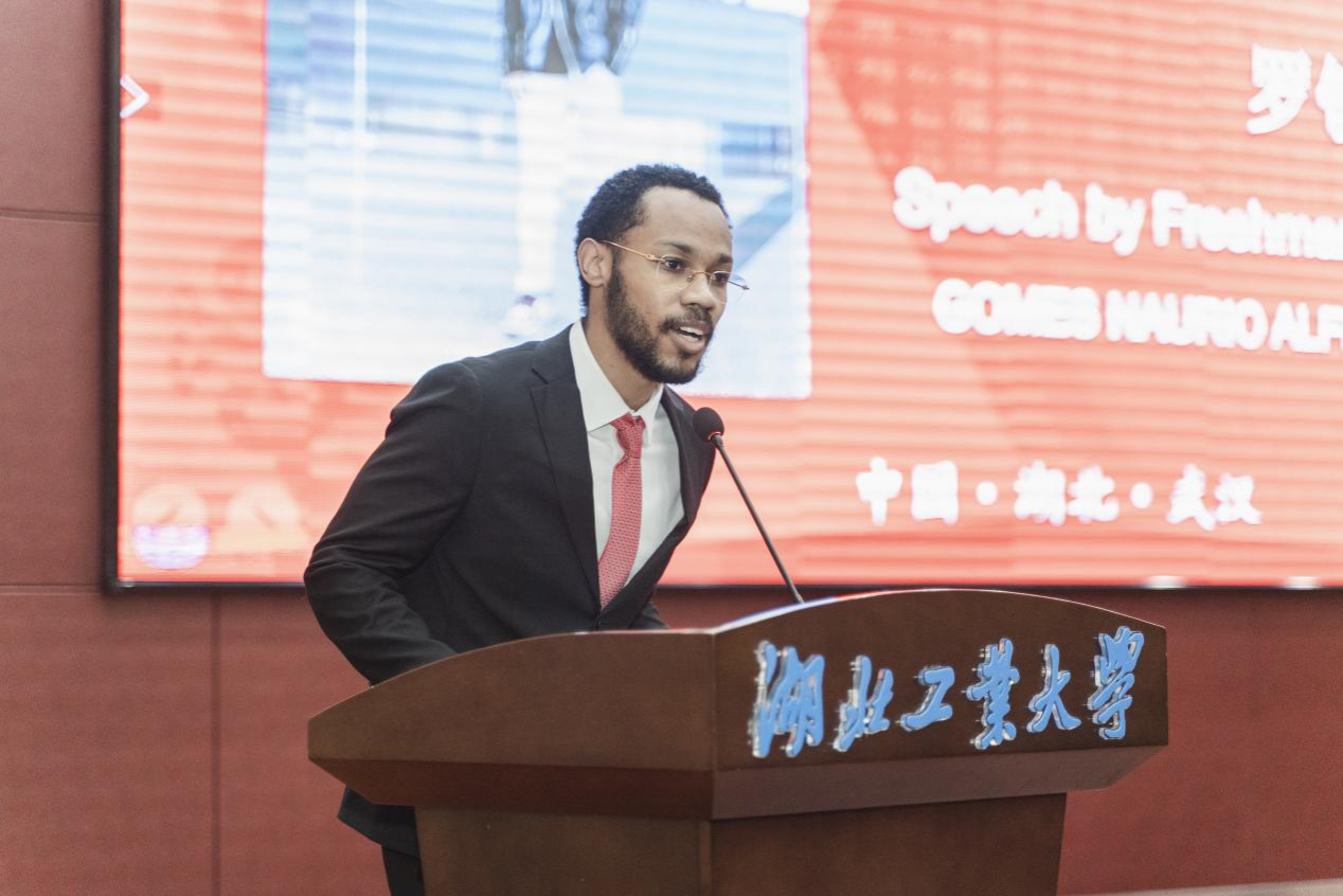 2023级计算机专业硕士研究生,来自安哥拉的罗锐作为新生代表发言。他鼓励在场全体新生在即将开始的职工涯中始终保持好奇之心与谦卑之心,在未来的学习中主动向老师请教、积极开展创新性研究,在留学期间积累从宝贵的学习与人生经验。