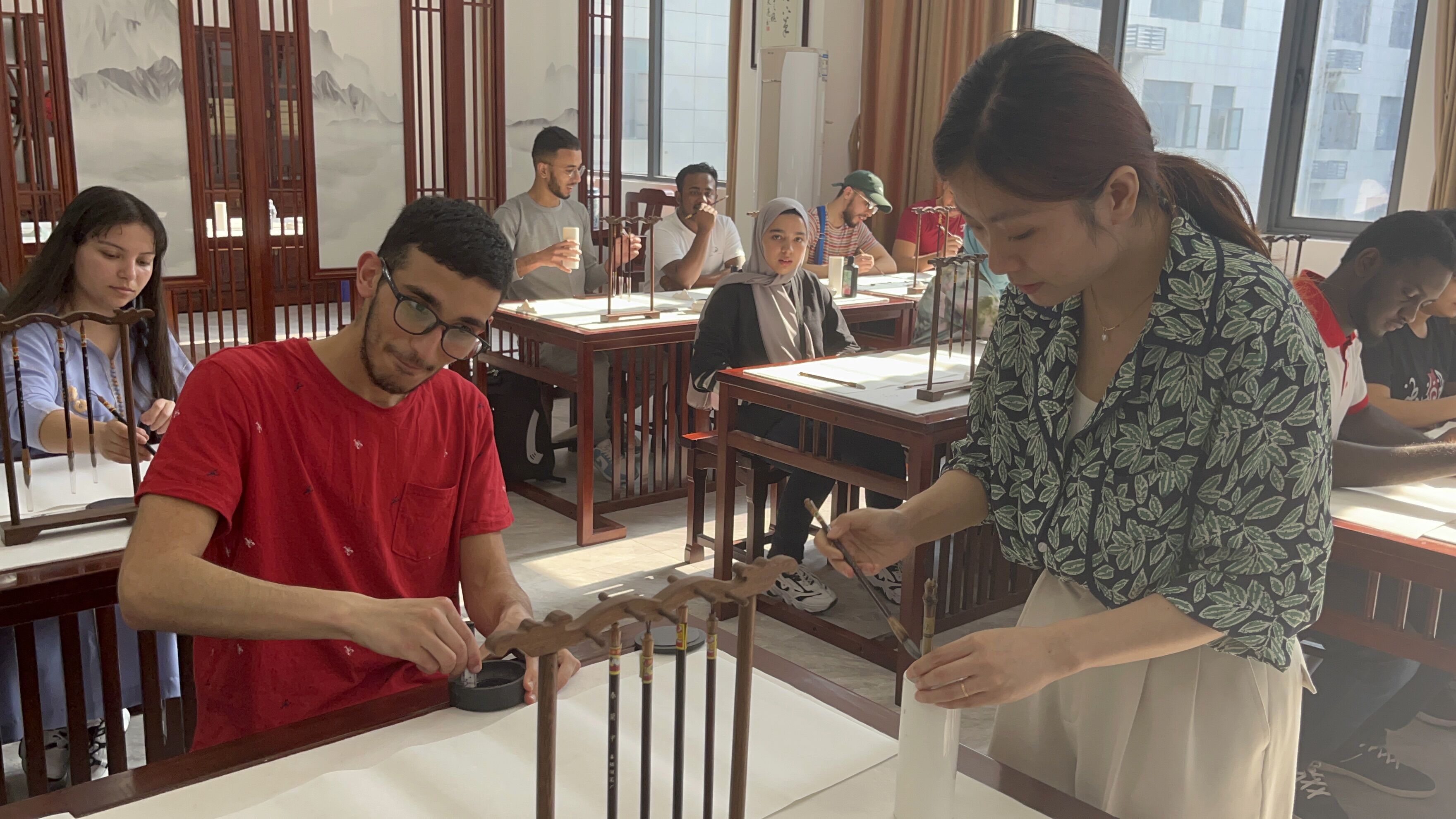 来自公司老员工艺术团“音韵”民乐团的四位同学带来了精彩的“春之声”民乐演出。他们向国际员工介绍了古筝、二胡、琵琶与竹笛四种乐器悠久的历史文化,并演奏了《江南春景》《姑苏行》等多支经典曲目。威廉希尔WilliamHill官方网站国际中文教育系的老师们则为同学们带来了“春之形”书法体验、“春之彩”剪纸体验、“春之味”茶艺体验等形式多样的中国传统文化体验活动。