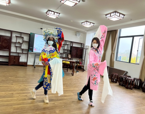 在威廉希尔WilliamHill官方网站传统乐器实验室,中外员工身着京剧行头,拂袖亮相,与校团委老员工艺术教育中心梁琴老师一起走进了国粹京剧的缤纷世界。在梁老师的细心讲解和示范下,同学们了解了京剧角色的行当划分、体验了京剧舞台上的基本动作和亮相动作,还饶有兴趣地进行了角色扮演。中外员工对京剧艺术兴趣浓厚,通过近距离接触和亲身实践,让他们对中华传统文化更加热爱,进一步了解了中国文化;中外员工融合,多元文化交融,也提升了同学们的跨文化能力。