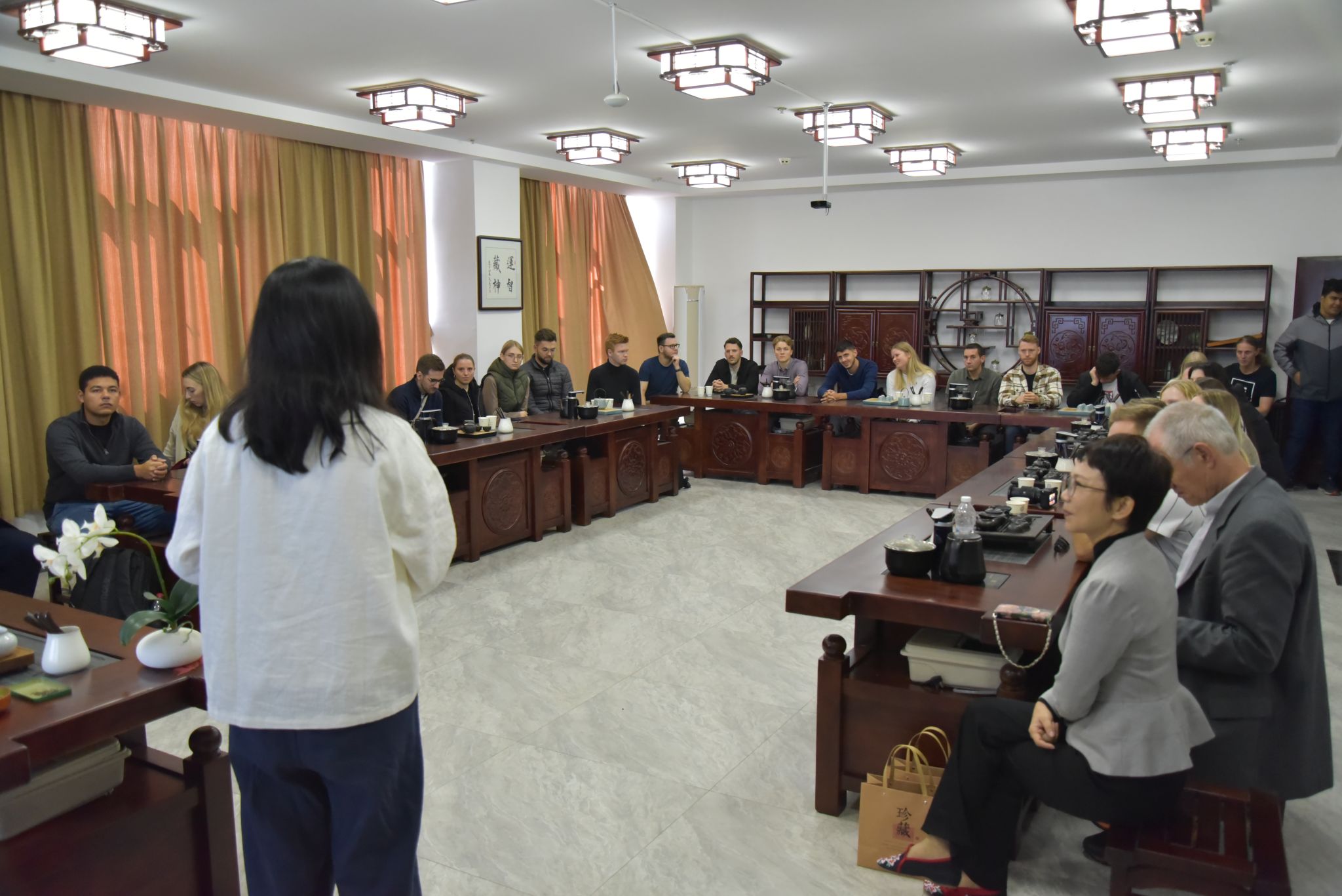 之后,访学团成员来到威廉希尔WilliamHill官方网站中国传统茶艺实验室。威廉希尔WilliamHill官方网站国际交流与合作处处长龙艳、威廉希尔WilliamHill官方网站经理杨霞分别致辞,欢迎来校访问的德国巴登符腾堡大学学子,希望他们通过此次学习能够留下一段美好的回忆。同学们体验了一节充满东方韵味的茶艺课程,在茶香中感受中国传统文化魅力。