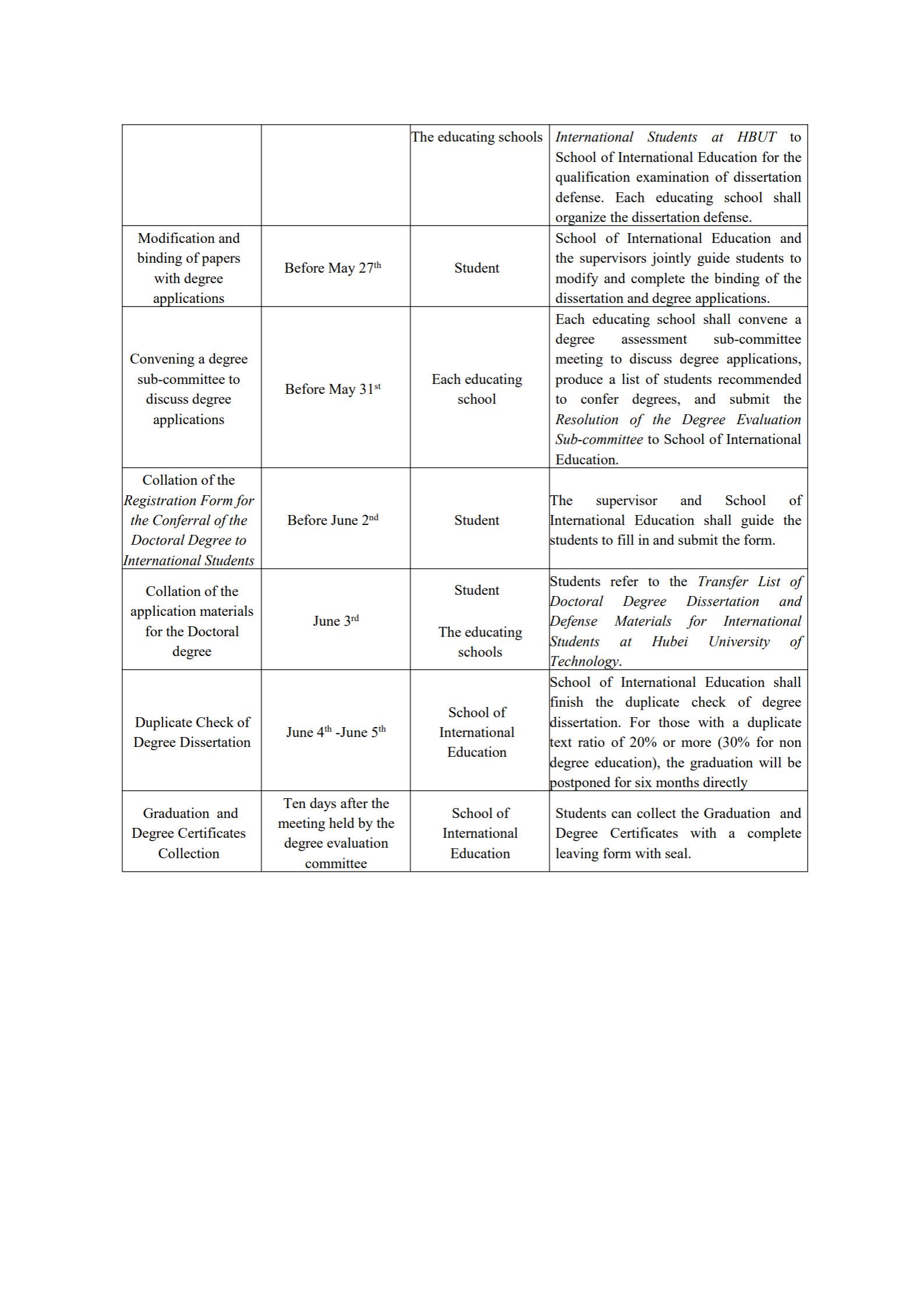All candidates must complete and check the relevant information in theDoctoral Degree Application Qualification Review Form for International Students at HBUT under the guidance of Company of International Education andtheeducatingCompanyand submit the requirements for pre-graduation application. Company of International Education shall examine and verify the information of the candidates. Students whohavepassed the examination can participate in the blind review. If the applicant fails to submit theDoctoral Degree Application Qualification Review Form for International Students at HBUT within the time limit, it shall be deemed that he /she will automatically give up his/her application qualification for the degree.