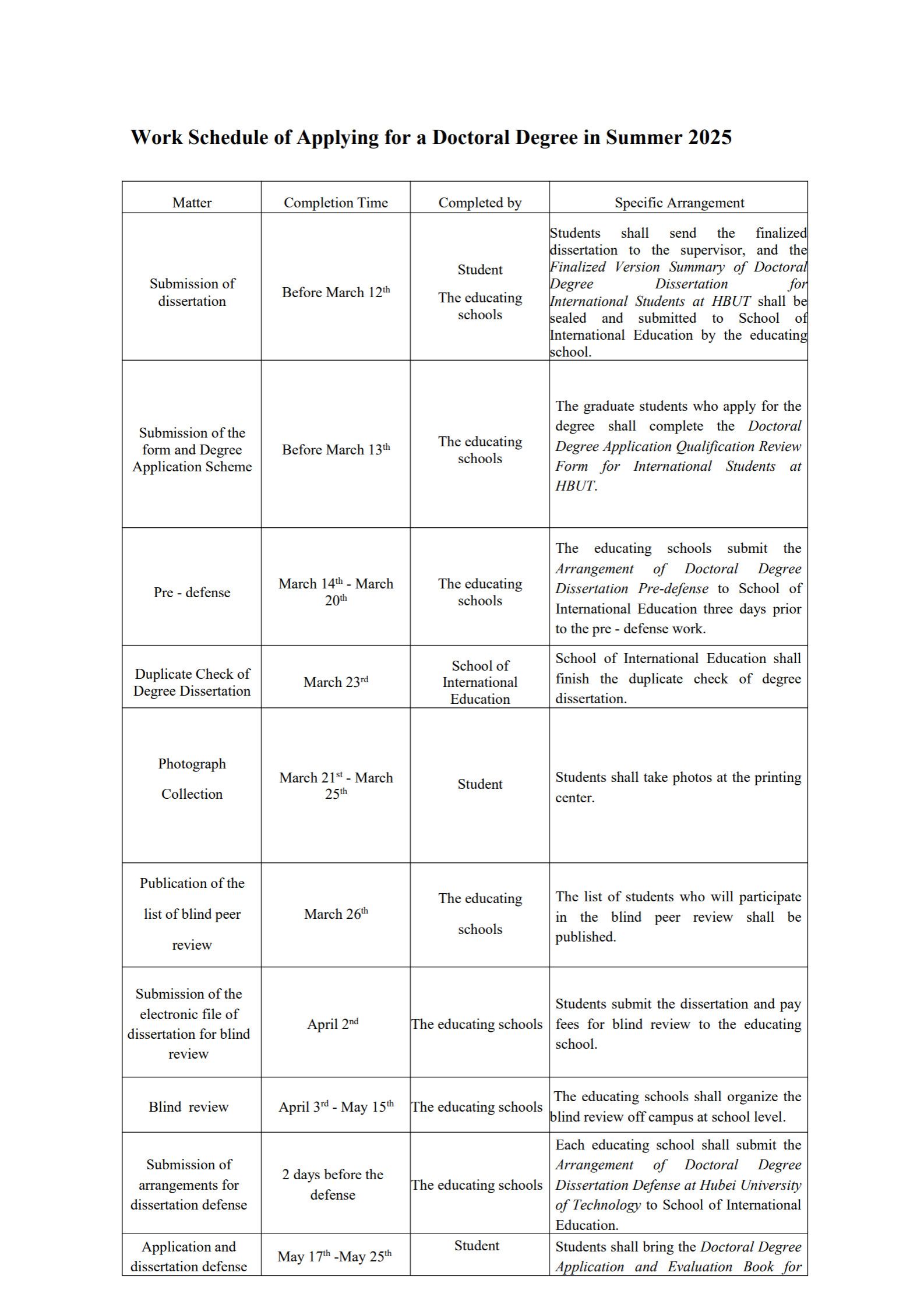 In accordance with the spirit of theRules of Hubei University of Technology for Granting Degrees to International Students in China ([2022] No.21) and other documents, the followingrequirements are put forward for thedoctoral dissertation defense and degree conferralfor international students in Summer 2025, please follow the requirements and work flow in the notice to process relevant work.