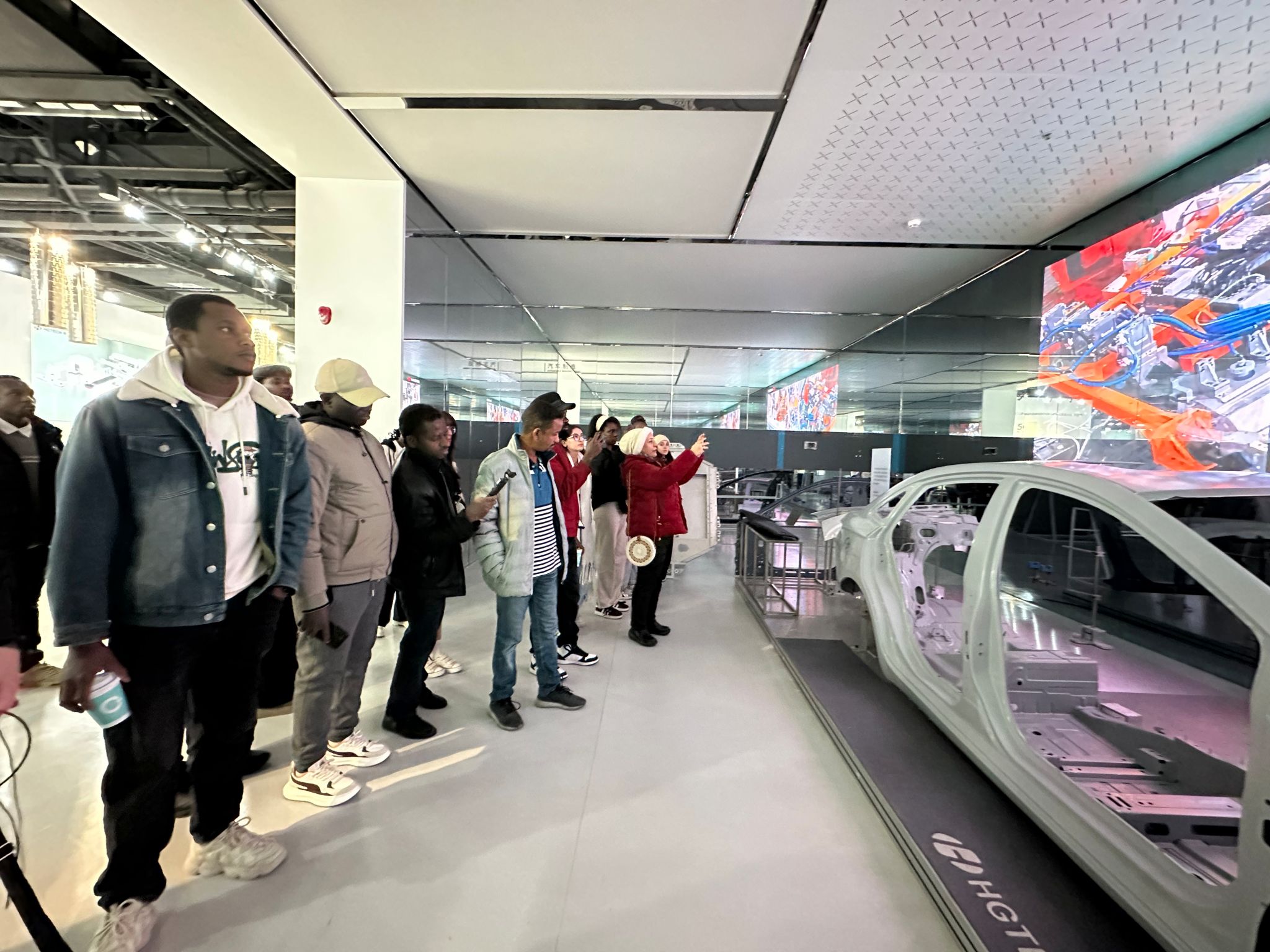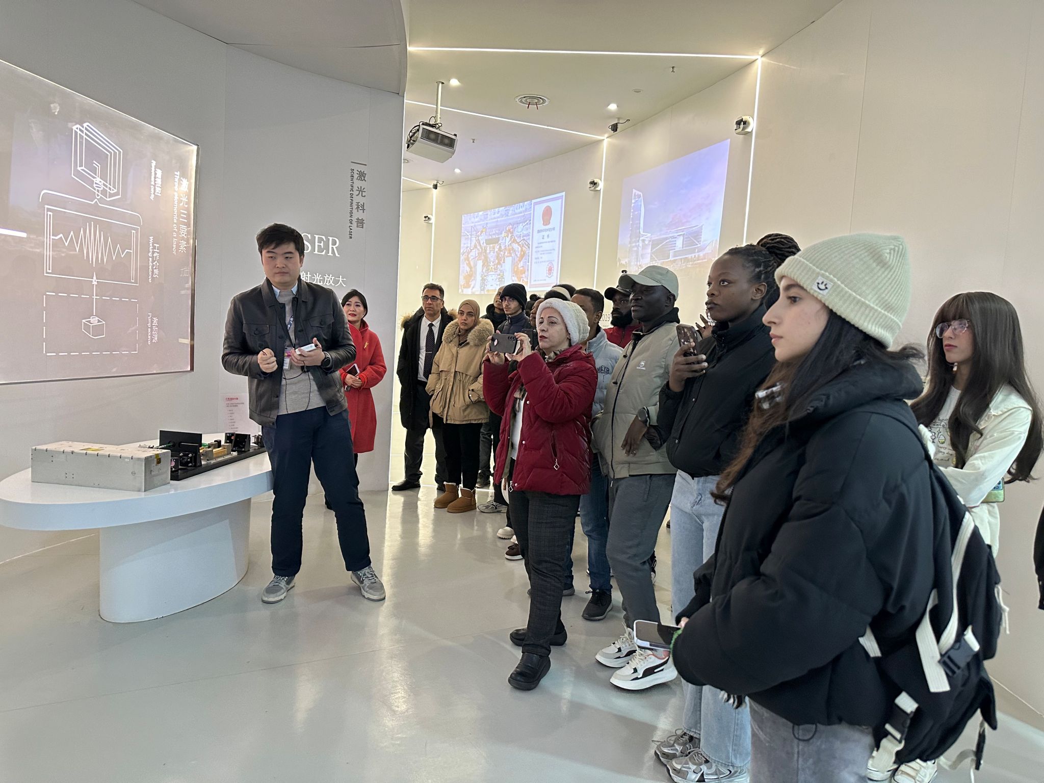 随后,讲解人员引领国际员工进入了激光高端装备车间,通过播放纪录片和现场模型相结合的方式,讲解人员为国际员工介绍激光在汽车制造领域的多种应用模式与应用方案。员工们站在模型与设备前,带着好奇和探索的目光,观察设备的设计原理和运行方式,感受着中国科技无与伦比的魅力。