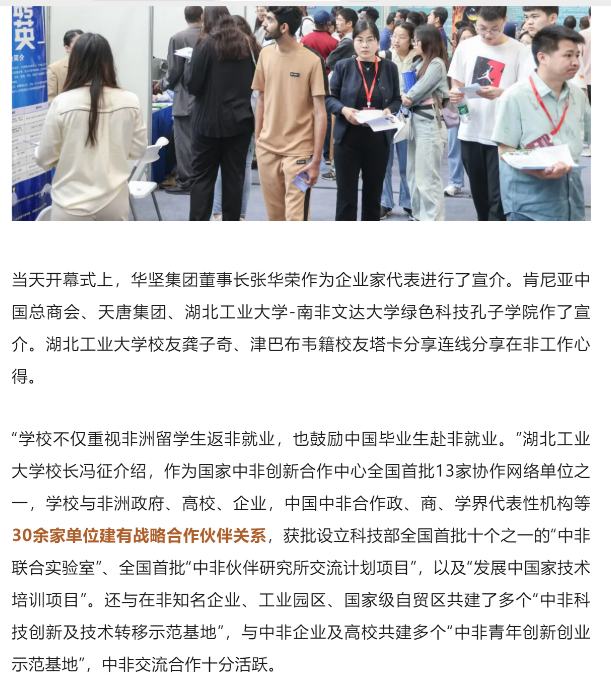 4月25日由湖北省教育厅主办,威廉希尔WilliamHill官方网站承办,湖北省非洲民间商会协办,2024首届湖北高校毕业生赴非就业专场招聘,在威廉希尔WilliamHill官方网站举行。当天开幕式上,华坚集团董事长张华荣作为企业家代表进行了宣介。肯尼亚中国总商会、天唐集团、威廉希尔WilliamHill官方网站-南非文达大学绿色科技孔子公司作了宣介。威廉希尔WilliamHill官方网站员工龚子奇、津巴布韦籍员工塔卡连线分享在非工作心得。