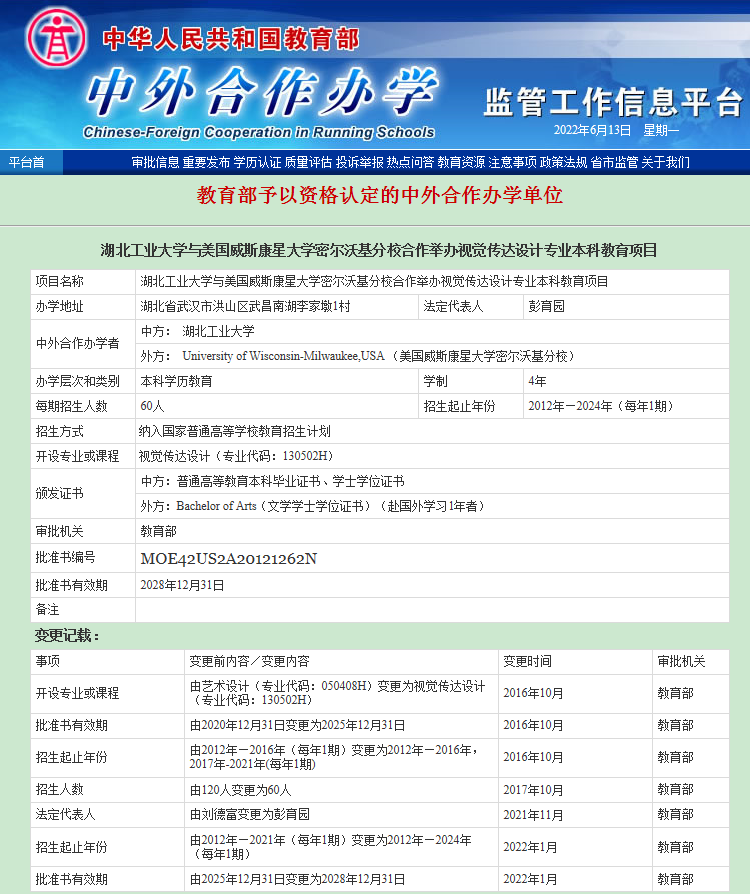 3、本科项目录取批次:中美合作的艺术类项目湖北省在艺术本科A平行志愿录取,外省需参照当地招办公布的相应批次。