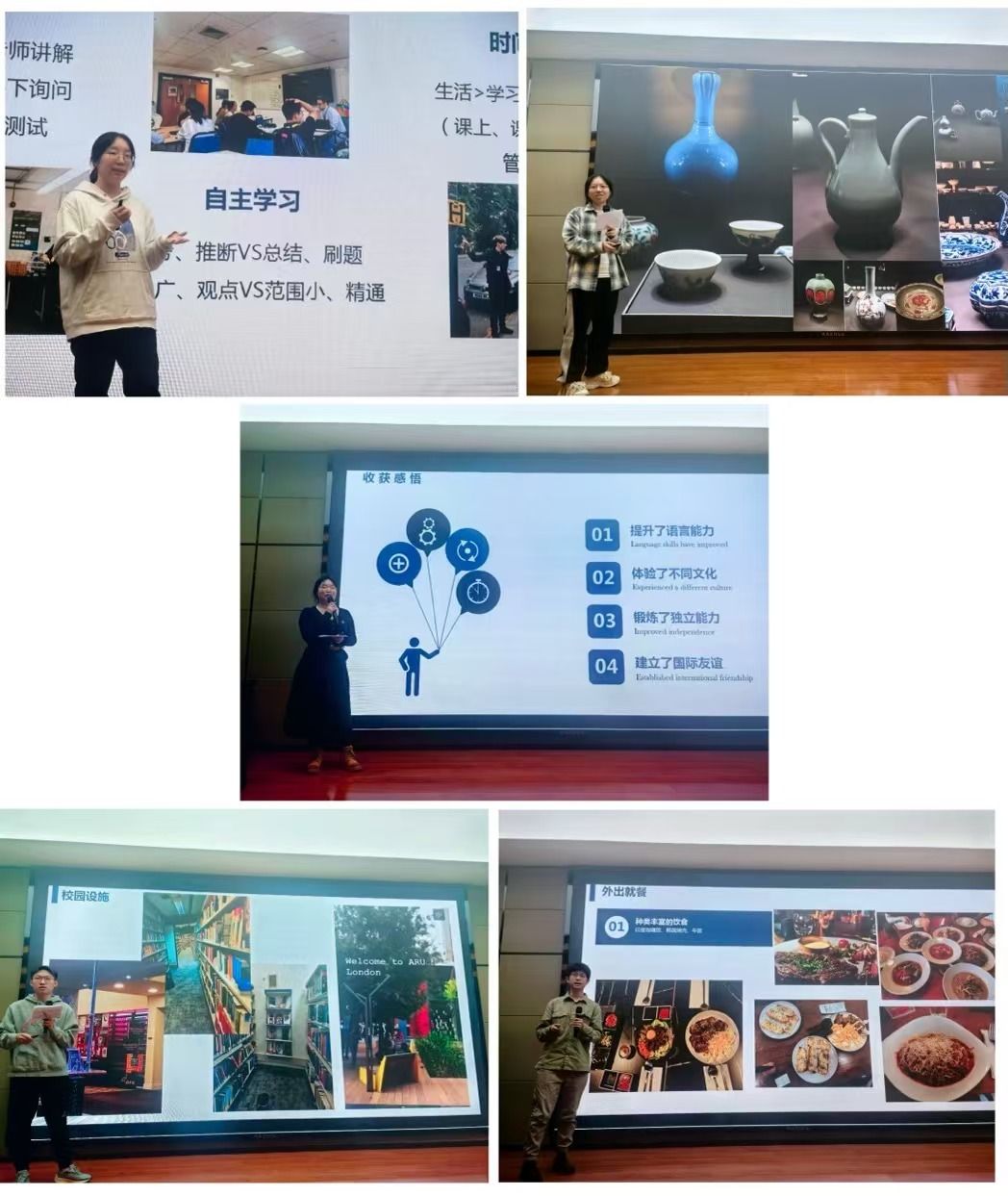 来自机械工程公司和电气与电子工程公司的吴桦煊、付菁菁、杨凤喆、马一鸣、郑可欣等5名同学分别从学习体验、人文景点、校园生活、饮食文化、收获感悟等不同层面分享了他们在英国学习生活的点点滴滴。同学们还通过两段短视频展示了各自在学习能力、文化适应能力和生活自主能力等方面的进步。分享会上,同学们纷纷表示,3周的海外切身体会拓宽了自己的国际视野,丰富了自身人生阅历,增强了对国际化、多元化的文化理念和思维习惯的了解,为树立学习与人生目标打下了坚实的基础。