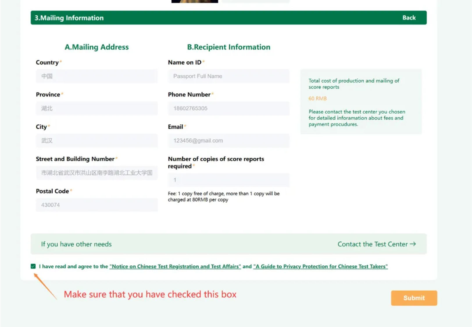 5. The score report will be delivered to you by Express. Please make sure that you have entered the right mailing information in the Mailing Page.