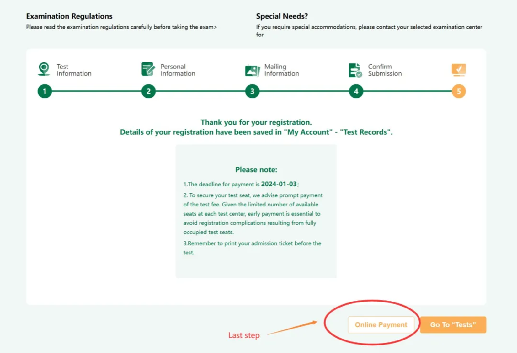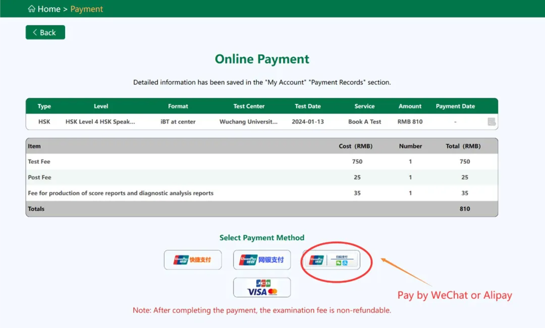 6. Select "pay online" to make your payment. The delivery fee of the Score Report may differ based on your address. Please refer to the total cost shown in the webpage. You can find the payment link at your “Personal Information Center” - “Pay Online”.