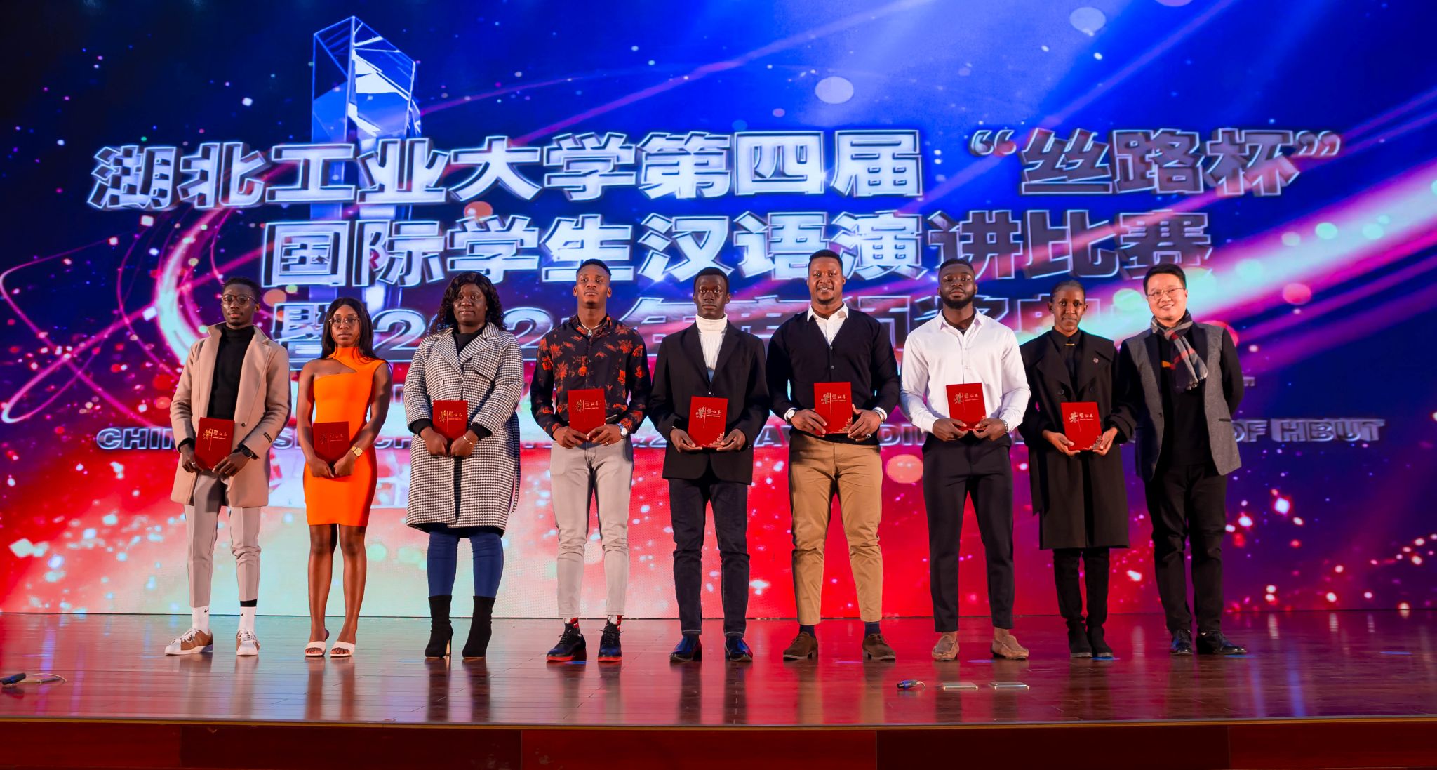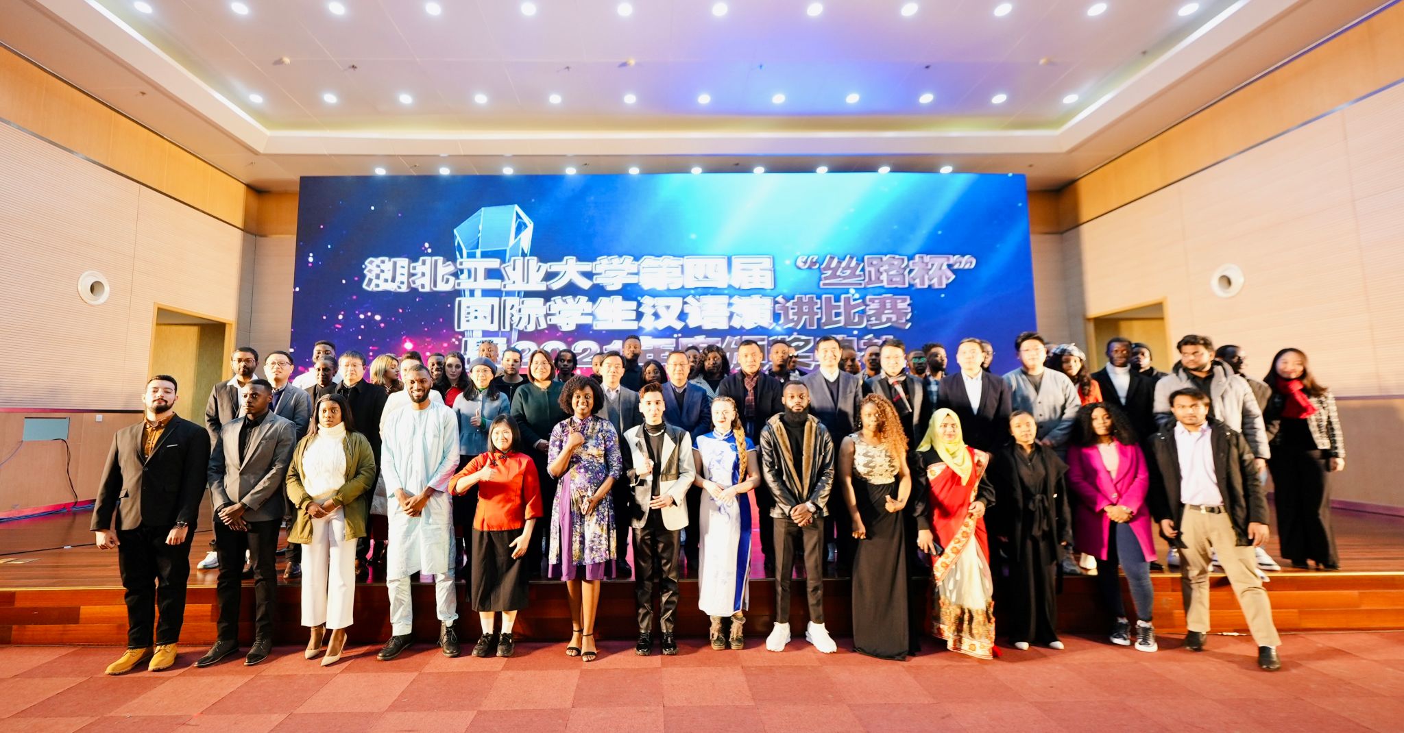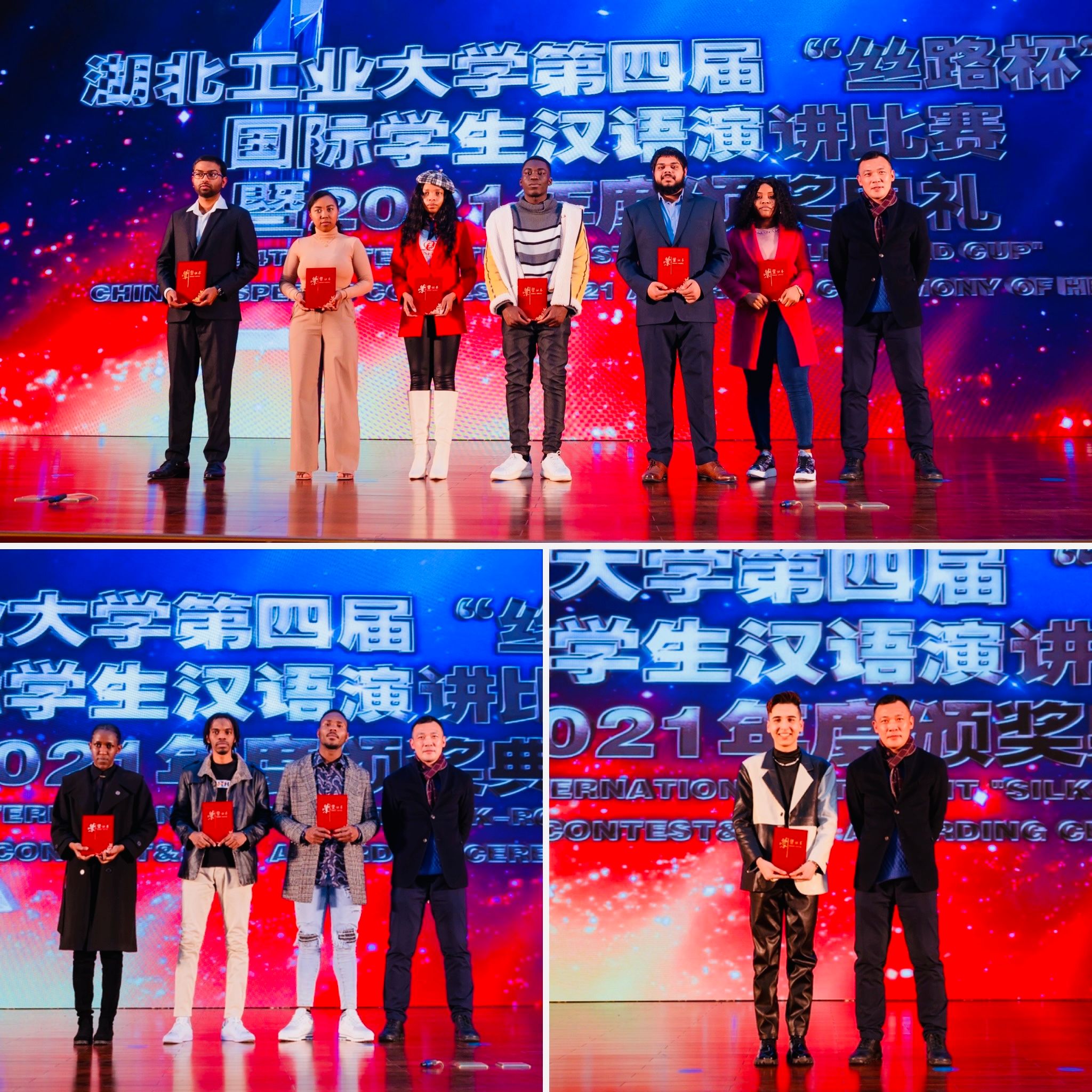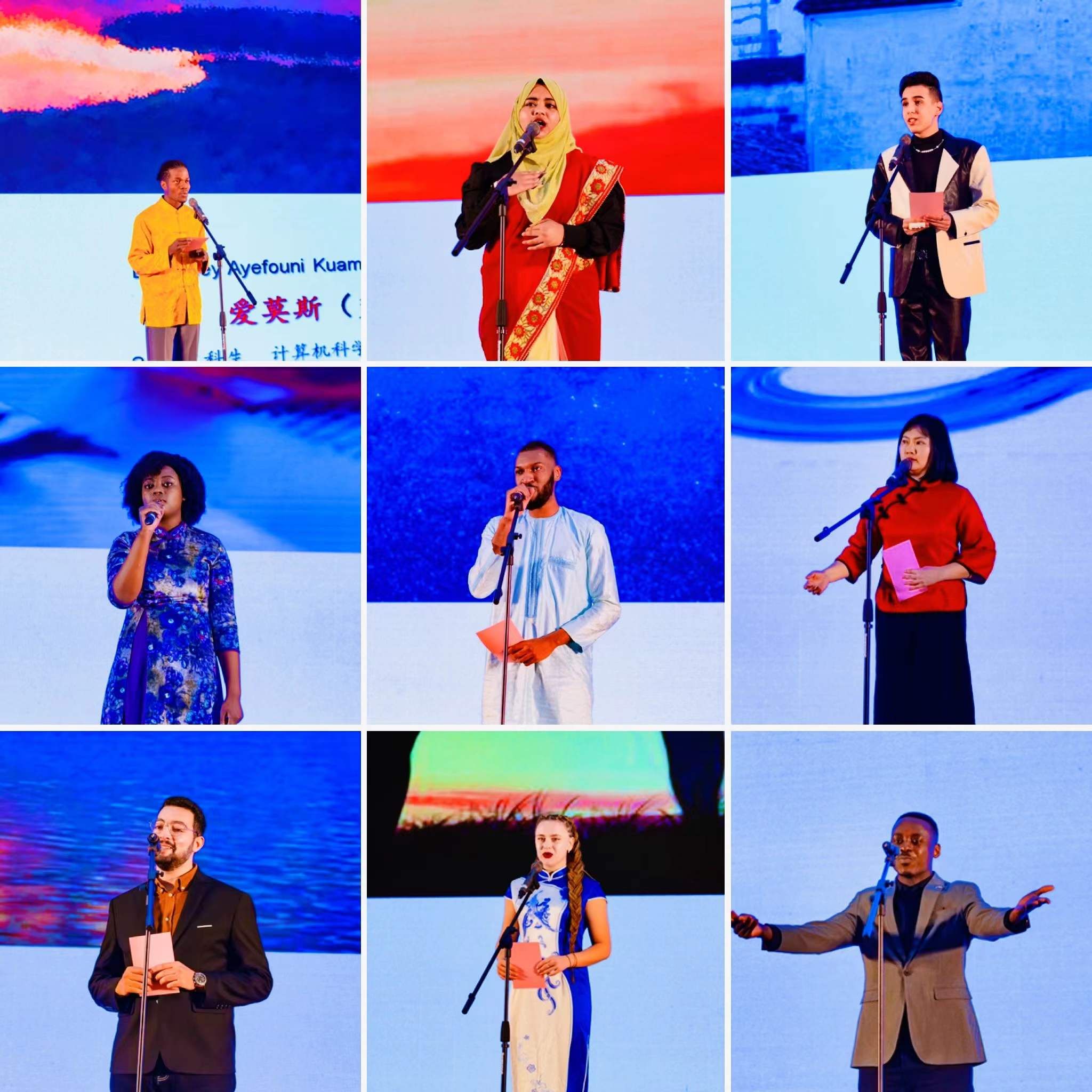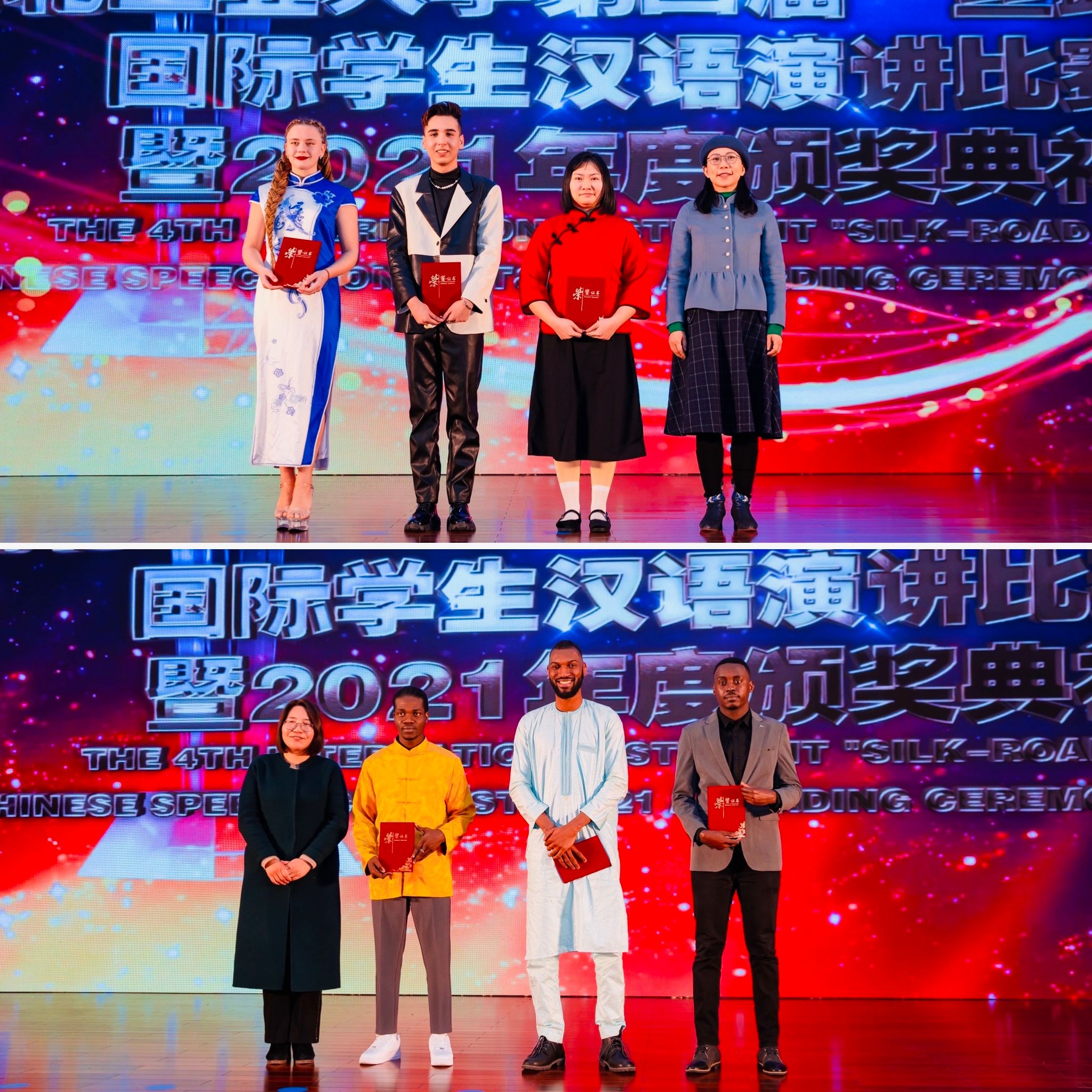 在“丝路杯”汉语演讲比赛的现场比赛部分,来自多哥、摩洛哥、刚果(金)、哈萨克斯坦、老挝、几内亚、赤道几内亚、孟加拉国等8个国家的9名选手同台竞技,他们通过现代诗朗诵和“我的中国故事”主题演讲两个环节,畅谈成长与梦想、诉说友谊与亲情、共赏中国美食与服饰、赞美中国精神与文化……充分展现他们的汉语水平,由衷地表达他们对中国的深情厚谊。