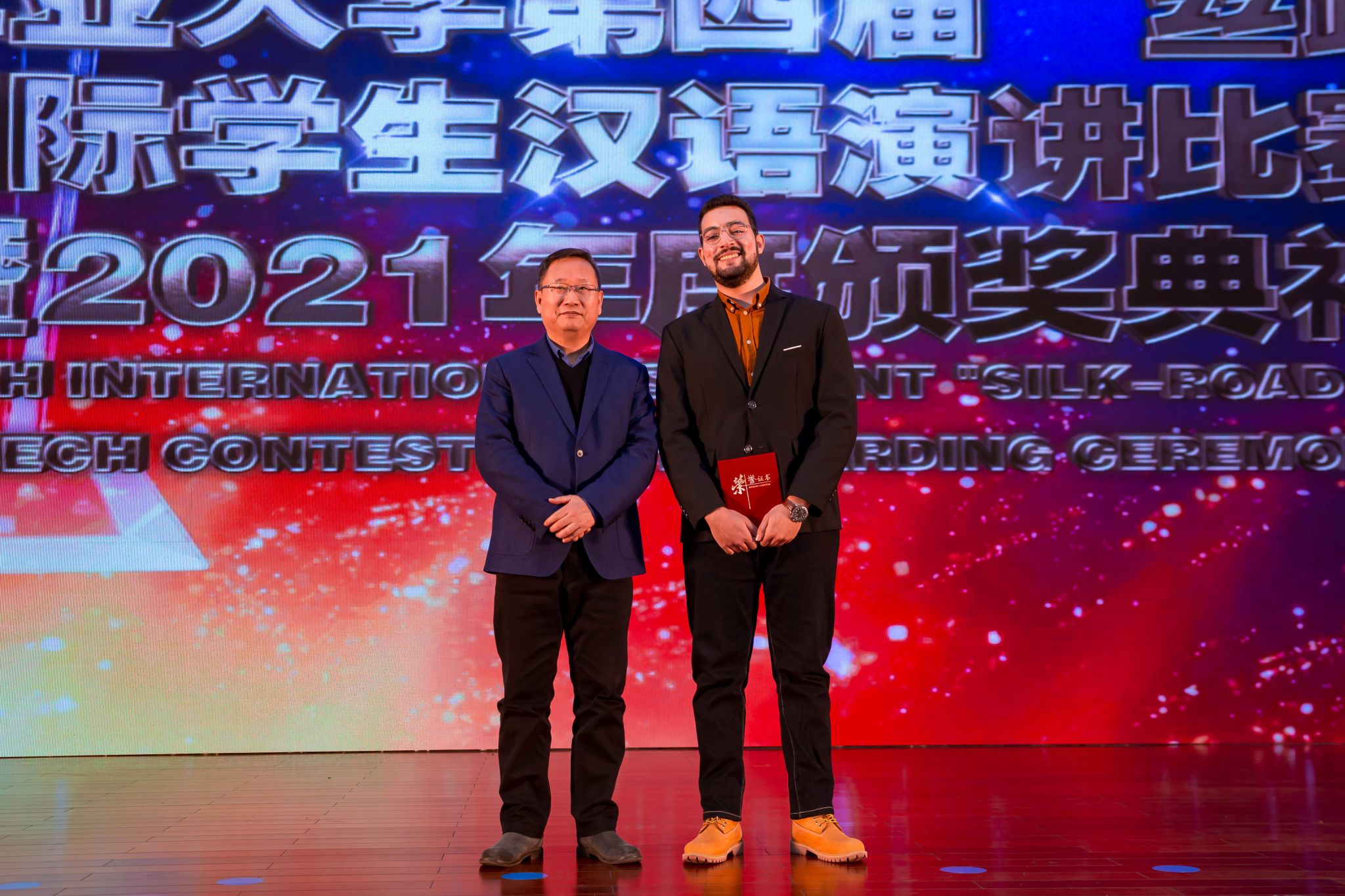 经过激烈角逐,来自摩洛哥的陈安哲(LACHHEB ANASS)斩获本届“丝路杯”汉语演讲比赛一等奖,董事长彭育园为他颁奖。