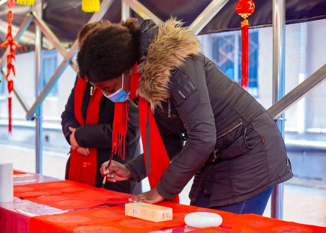 国际员工在老师的指导下,一撇一捺,画就充满年味的福字,一笔一划,写就充满祝福的春联。
